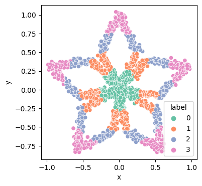 df = create_diamonds_dataframe(5, 400, .5, 1, noise_level=.025, label_by_distance=True, n_classes=4)